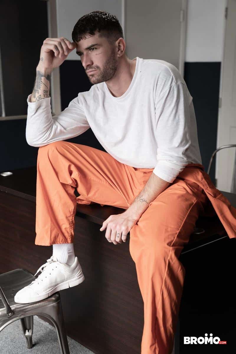 The orange jumpsuit-wearing bad boy just wants to have fun, starting with sucking Adrian’s cock, then he turns the tables and fucks Adrian’s face.